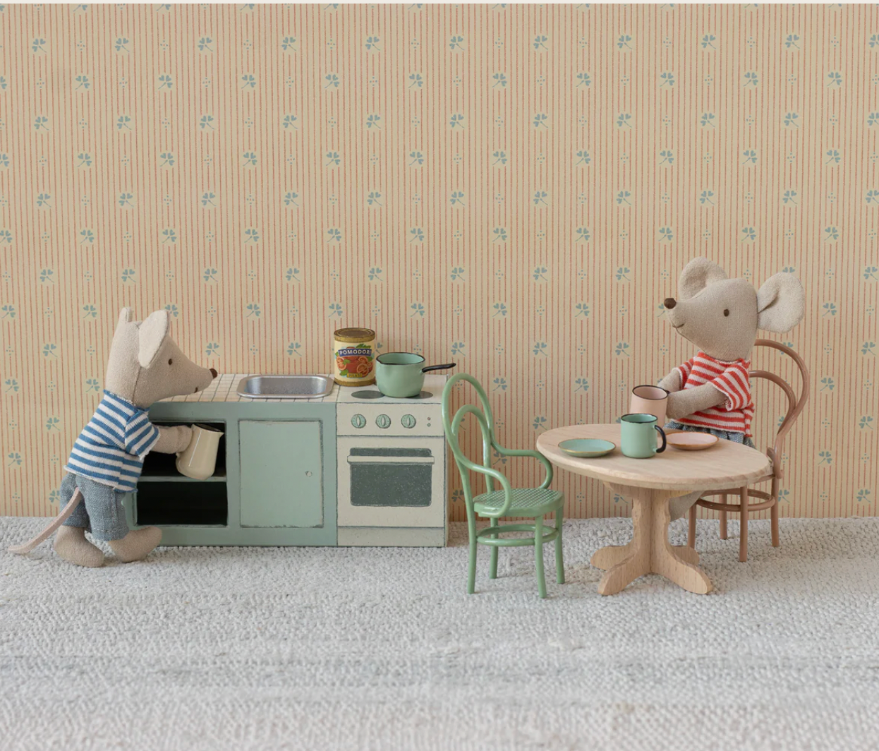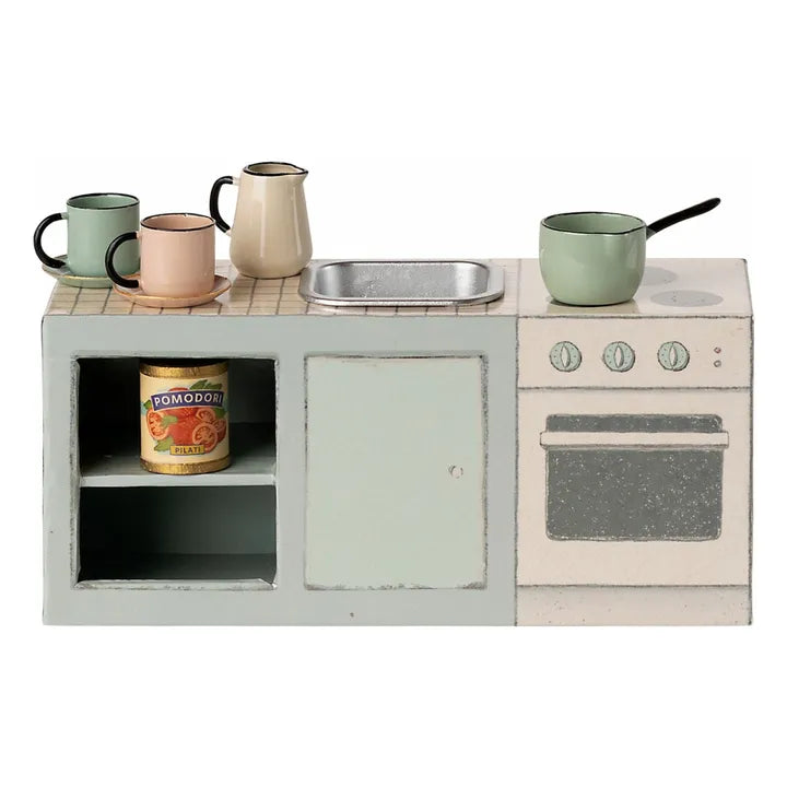 Il piccolo bancone da cucina è dotato di 2 tazze e 2 piatti, una pentola, una brocca e una piccola lattina. Il piccolo lavello è realizzato in metallo per sembrare il più realistico possibile. Si adatta perfettamente alla cucina della casa del topo SuitCasa.