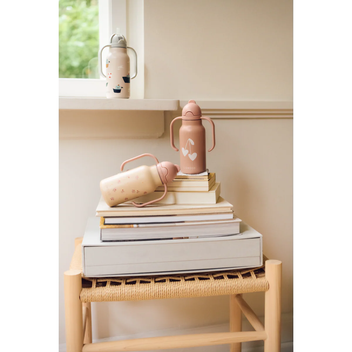 Borraccia termica in metallo con cannuccia e maniglie per una presa comoda.