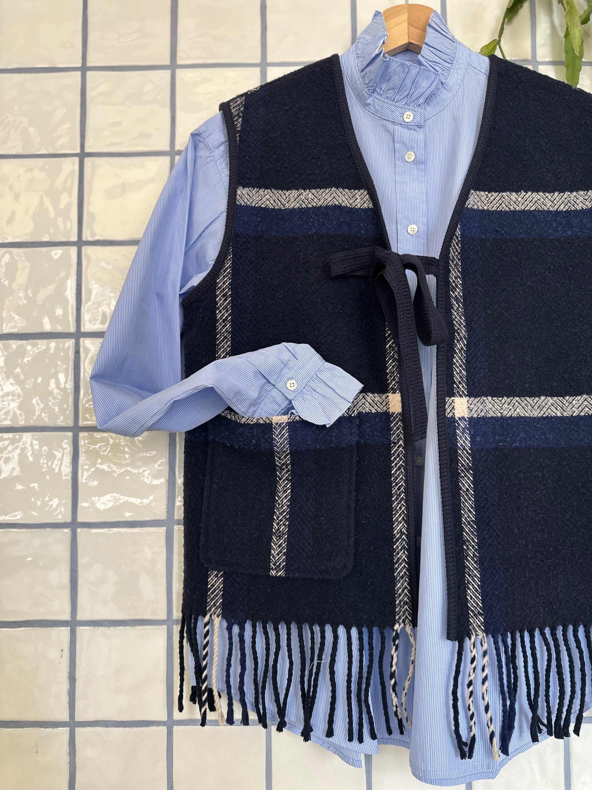 Camicia ampia da donna con collo alto arruffato in popeline di cotone con strisce sottili. Abbottonatura a vista con bottoni in madreperla. Granci leggermente abbassati e polsini stretti con volant. Piccole fessure laterali e orlo liquette.
