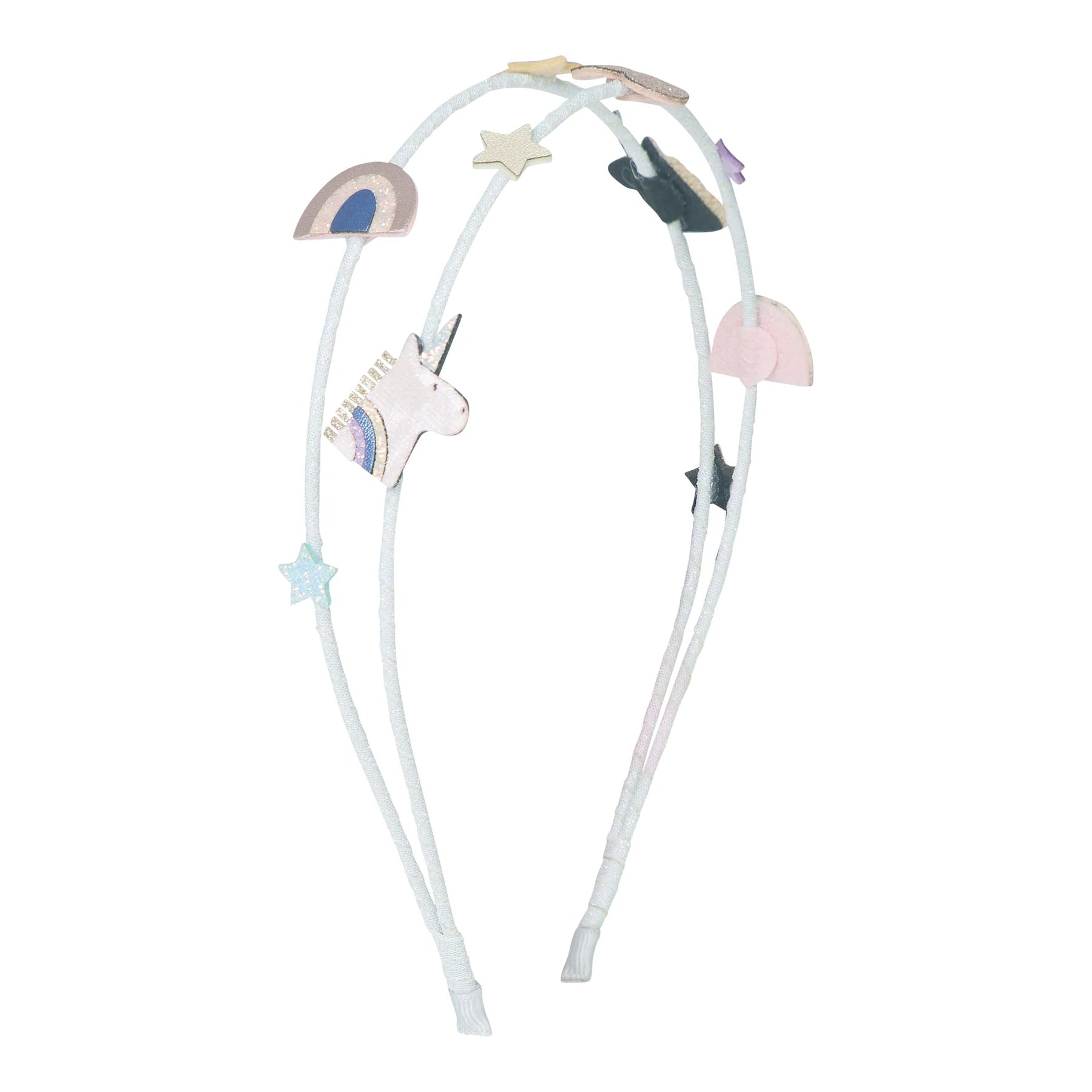 Aggiungi un tocco di magia mitica ai loro capelli con la nostra doppia Alice unicorno Celeste! Unicorni morbidissimi, arcobaleni, stelle e cuori si uniscono in una deliziosa palette pastello per un look che adoreranno!