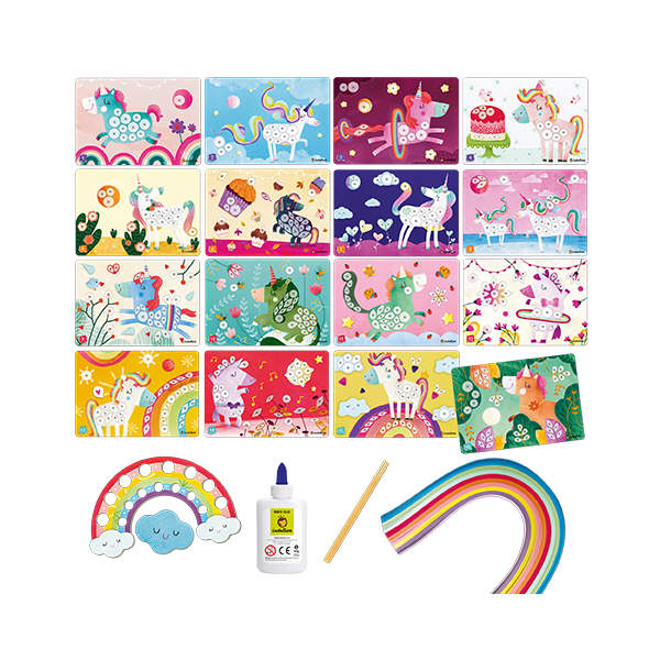 Decoro con la Carta è un divertente gioco creativo che permette ai bambini di decorare magici unicorni con tanti riccioli di carta multicolore. Questo gioco introduce i bambini alla quilling art, un'originale tecnica artistica che consiste nell'arrotolare strisce di carta colorata e incollarle sulle immagini per creare splendide decorazioni. Nella scatola è incluso tutto l'occorrente per sperimentare questa tecnica e un manuale di istruzioni che insegna passo passo come realizzare le opere d'arte.