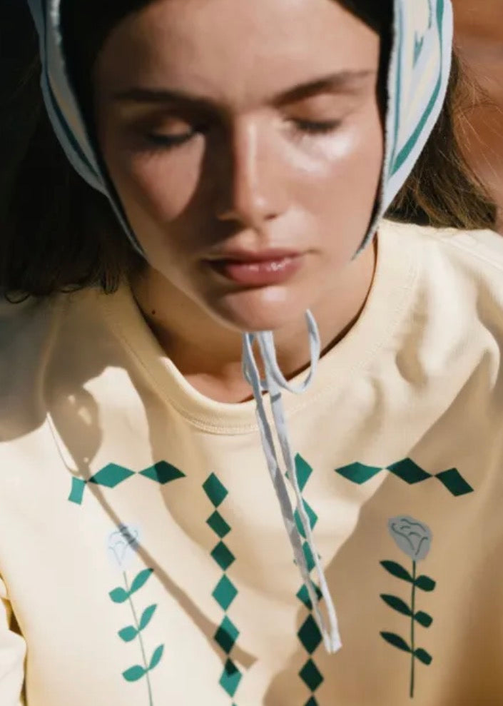 Realizzata in puro cotone French terry, questa felpa dal taglio rilassato presenta una stampa a fiori e diamanti sul davanti e sulle maniche. Presenta spalle leggermente scese, scollo e orli a coste.