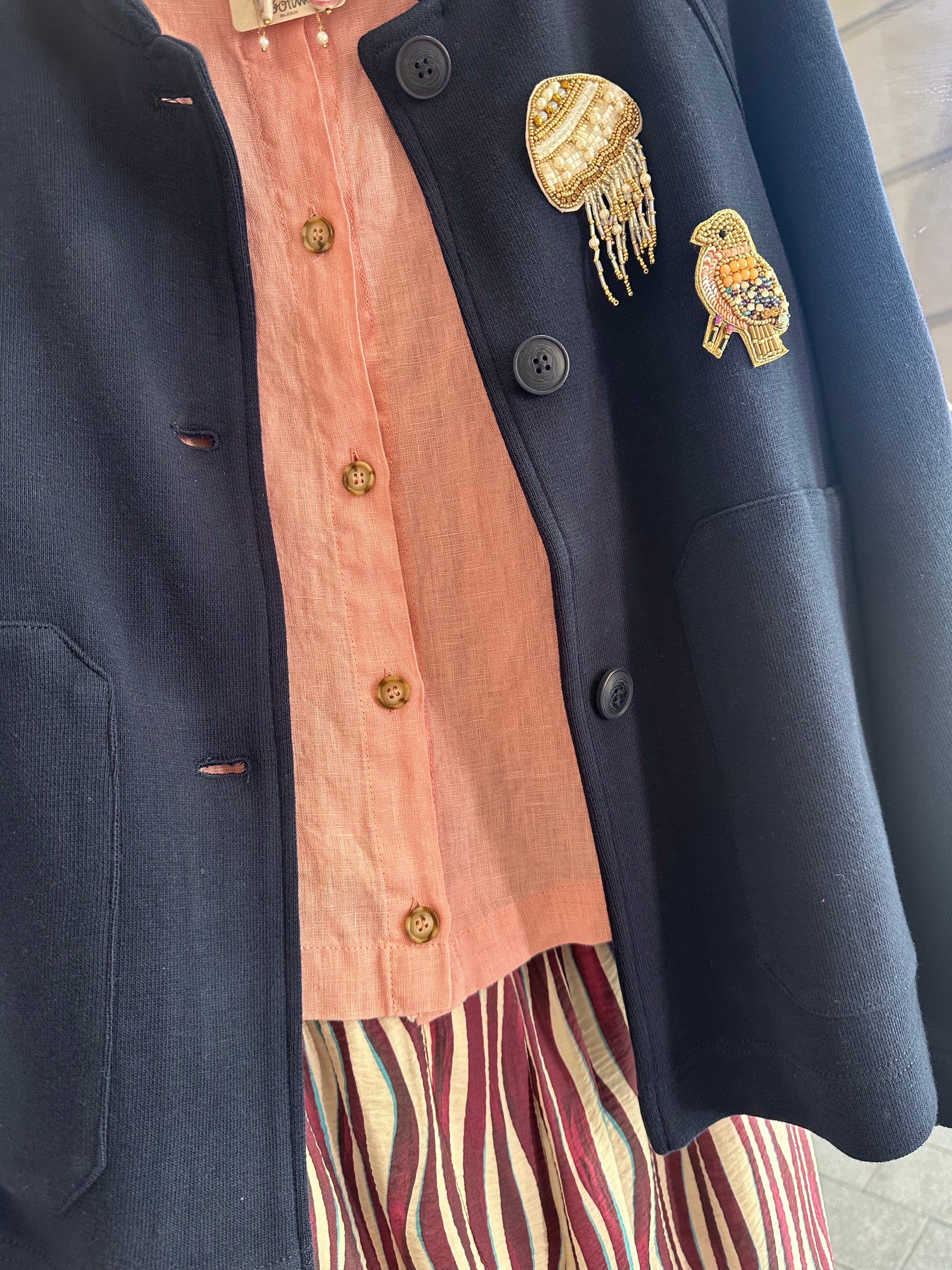 Giacca abbottonata. Collo alla camicia, tasche sul davanti e spacco centrale sul retro. Manica lunga scesa.