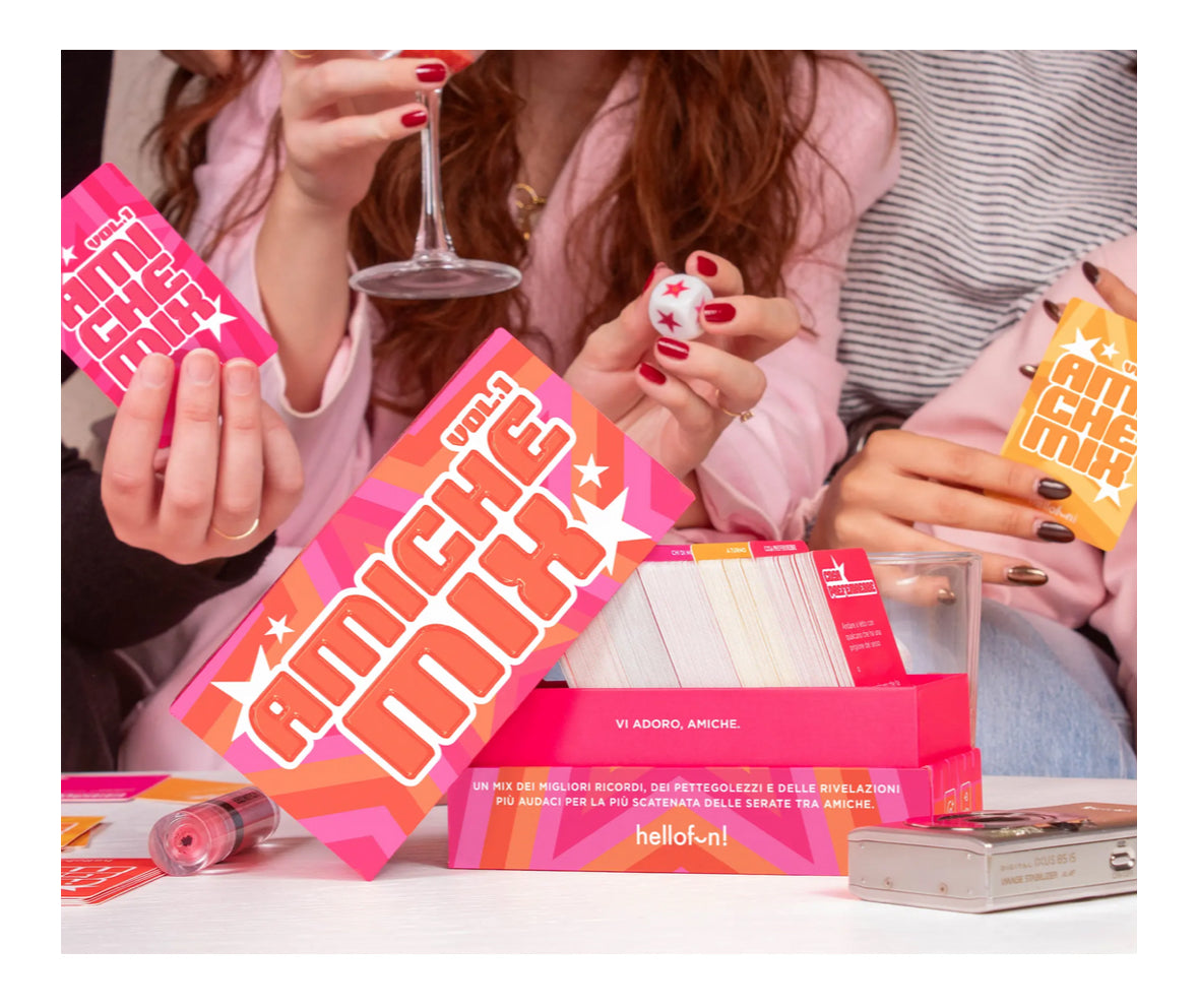 Un mix dei migliori ricordi, dei pettegolezzi e delle rivelazioni più audaci per la più scatenata delle serate tra amiche. Quello che succede con Amiche Mix, rimane da Amiche Mix. Ricordi e risate garantite con la migliore compilation di confessioni, sfide e domande per ogni pigiama party, serata tra ragazze o, perché no, per un addio al nubilato.