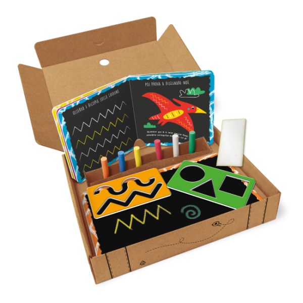 In una valigetta da portare sempre con sé sono contenuti un libro e un set di lavagnette scrivi e cancella e 6 gessetti colorati per divertirsi, imparando a tracciare le prime linee. Un percorso per i più piccoli per sperimentare con divertimento lo sviluppo del segno grafico, propedeutico alla scrittura.