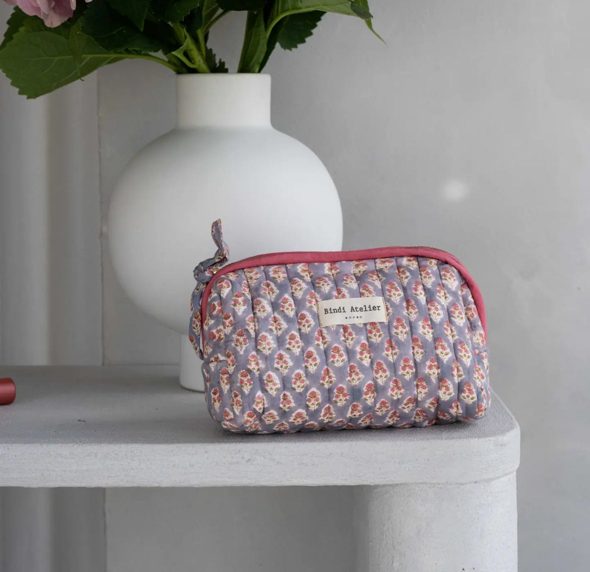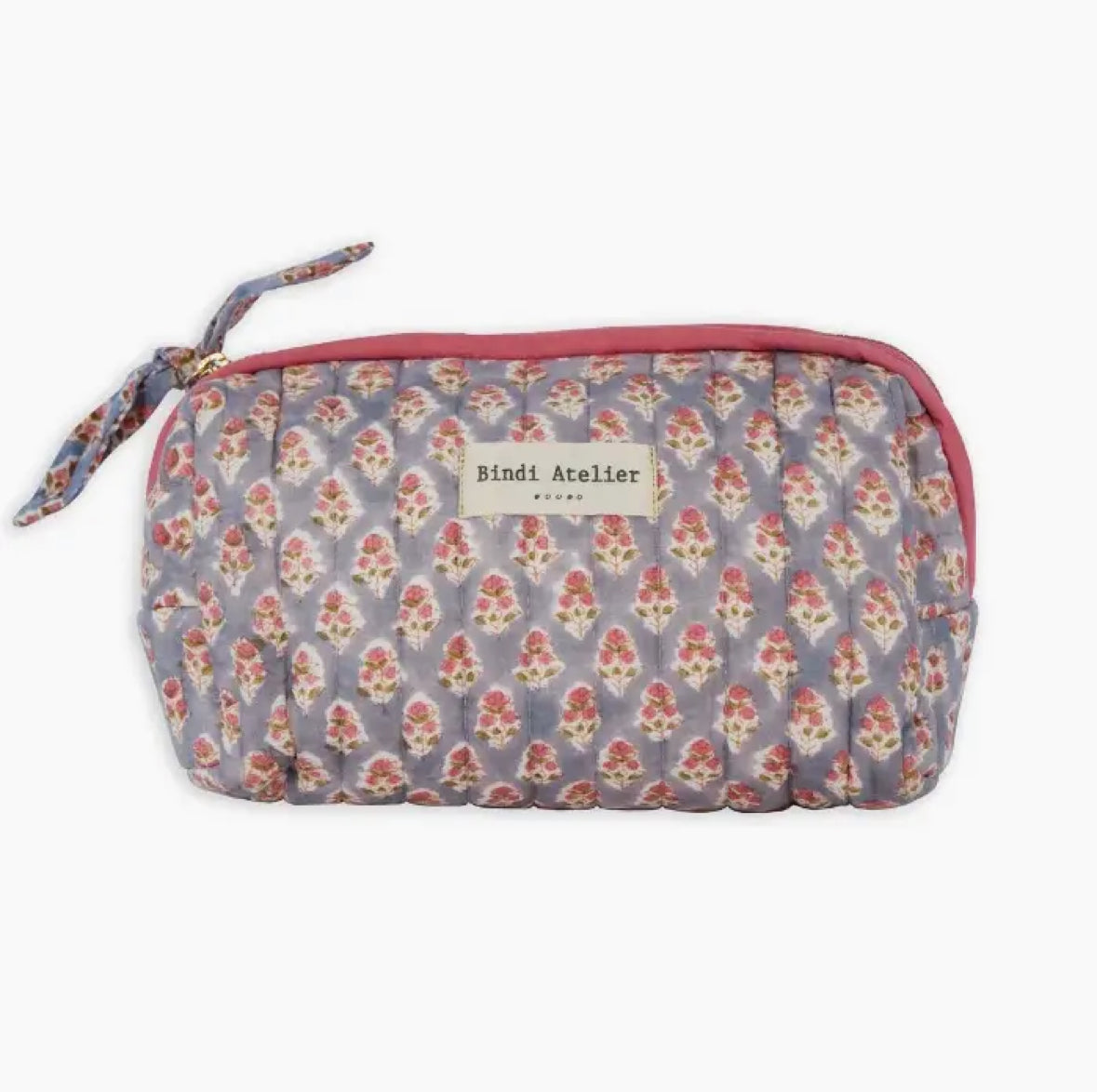 Dettagli del prodotto: - Trousse per il trucco: 21x11x10cm - 100% cotone trapuntato stampato a blocchi di legno. - Ampia apertura - 2 tasche interne - Chiusura lampo ornata con un fiocco stampato Composizione e cura: Data la natura artigianale della stampa, consigliamo di pulire il tuo articolo con cura: lavaggio a mano o in lavatrice a 30° con ciclo delicato. Non asciugare in asciugatrice.