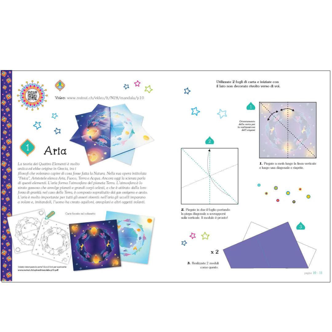 I mandala sono disegni con un centro intorno a cui si espandono altre figure con una certa simmetria. Aiutano a scoprire bellezza e gioia di vivere dentro di noi, perché le relazioni geometriche e l’integrazione di linee, colori e di forme comunicano un senso di armonia: quale soggetto migliore per un libro di origami per bambini?