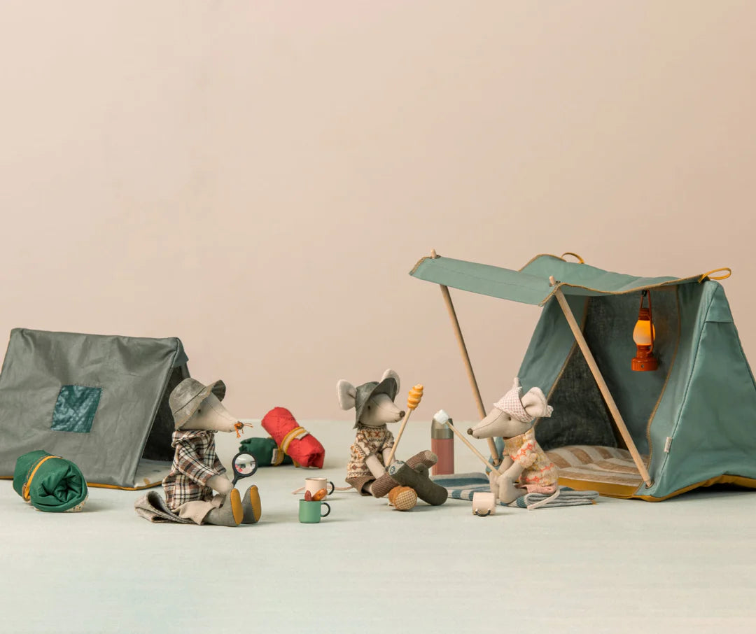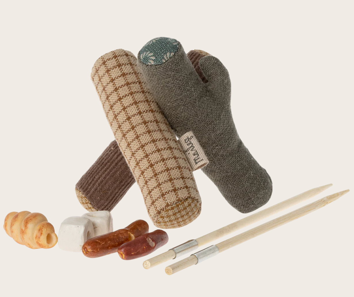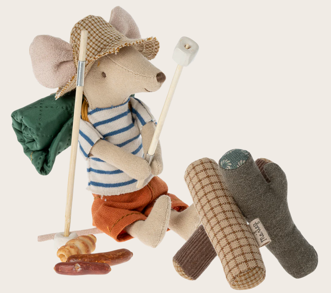 Quando i topi escursionisti sono in gita, adorano sedersi accanto al fuoco e preparare il cibo. Questo set viene fornito con bastoncini, cibo e rami. I bastoncini hanno una piccola parte metallica in modo che i topi escursionisti possano tenerli con le loro zampe magnetiche.