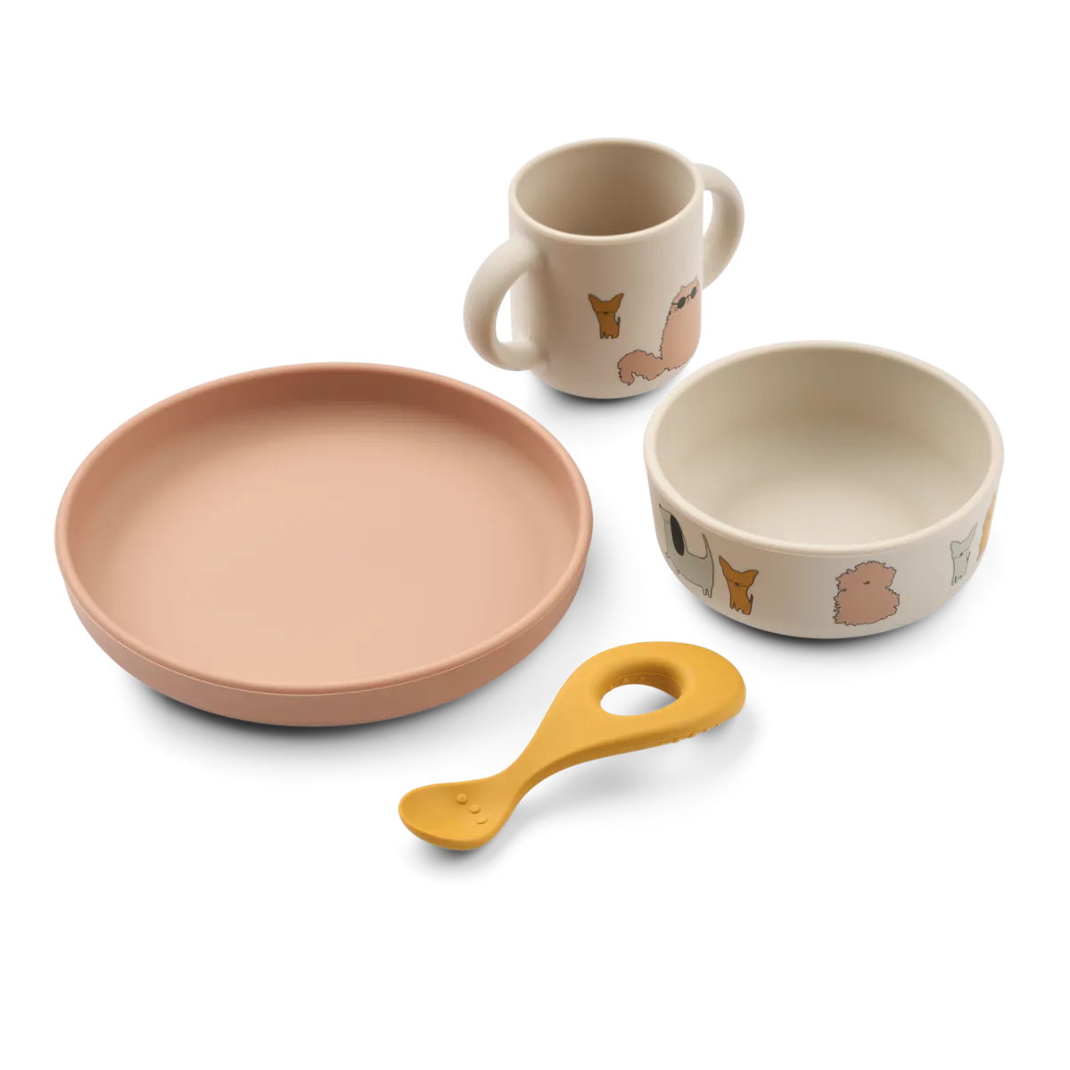 Il set include piatto piano, piatto fondo, bicchierino e cucchiaio morbido.