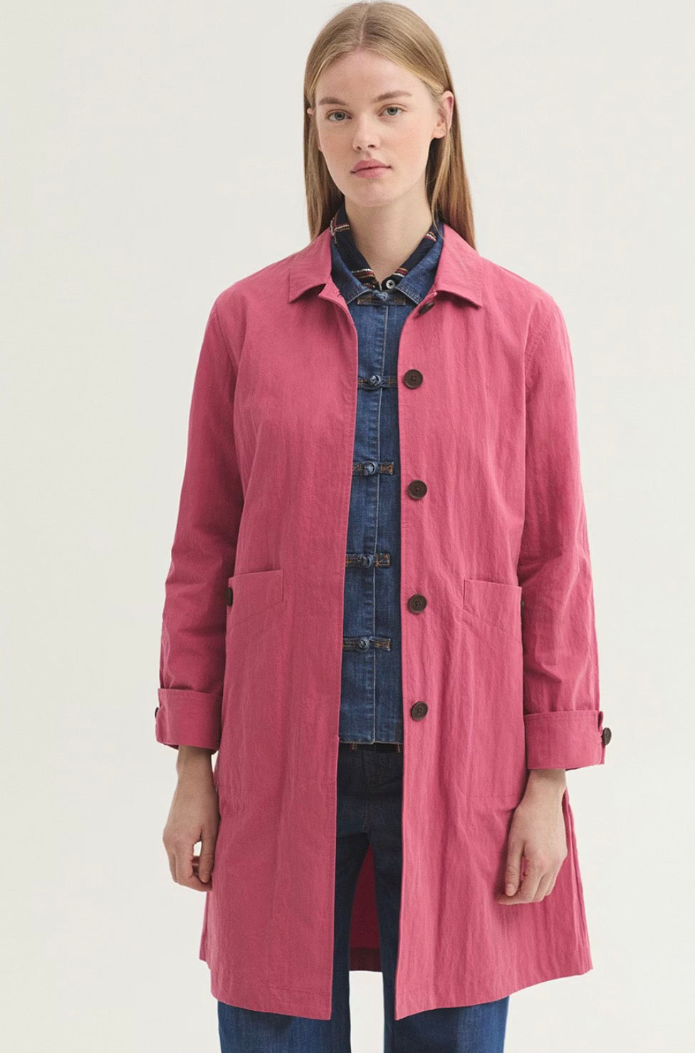 Spolverino idrorepellente realizzato in misto cotone e nylon. Presenta collo a camicia, abbottonatura frontale nascosta e tasche con bottone. Include spacco e bottone sul retro e manica rifinita con risvolto e bottone.