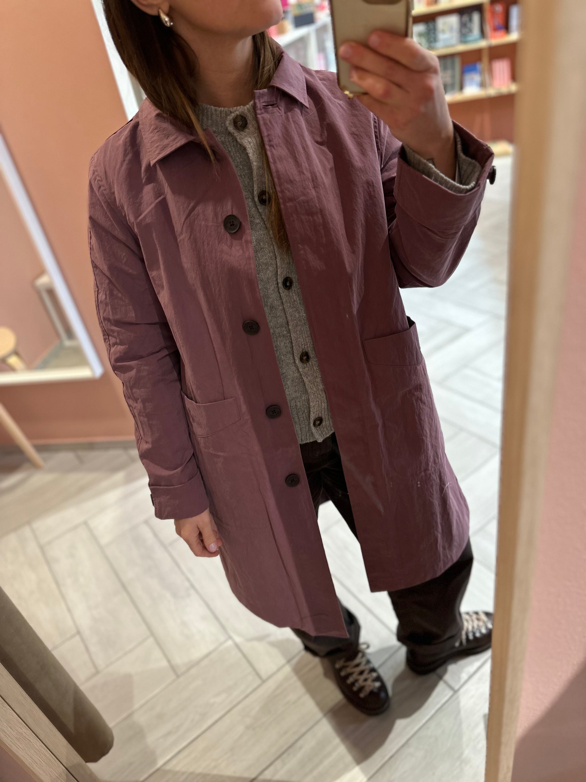 Spolverino idrorepellente realizzato in misto cotone e nylon. Presenta collo a camicia, abbottonatura frontale nascosta e tasche con bottone. Include spacco e bottone sul retro e manica rifinita con risvolto e bottone.