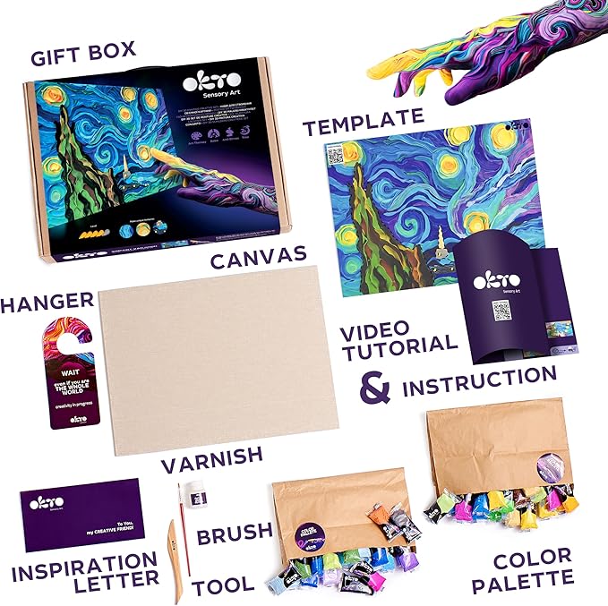 Nella scatola troverai diversi colori di plastilina, una spatola da modellare e una tela.