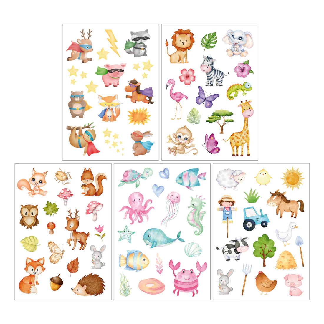 Il nostro set di tatuaggi di animali contiene graziosi motivi di supereroi, ambientati sottomarini, fattorie, safari e foreste. I tatuaggi sono ideali da regalare e condividere e riscuotono un successo assicurato alle feste di compleanno, ai matrimoni o agli asili nido di qualsiasi bambino . Sono perfetti anche come bomboniere o semplicemente come piccolo regalo. Rendiamo il mondo un po' più colorato!