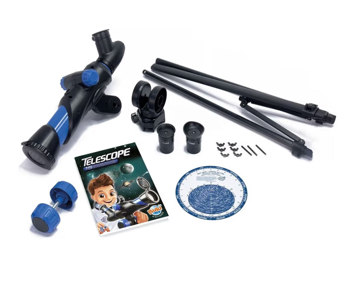 - Un telescopio per l'iniziazione con istruzioni che contengono 15 attività