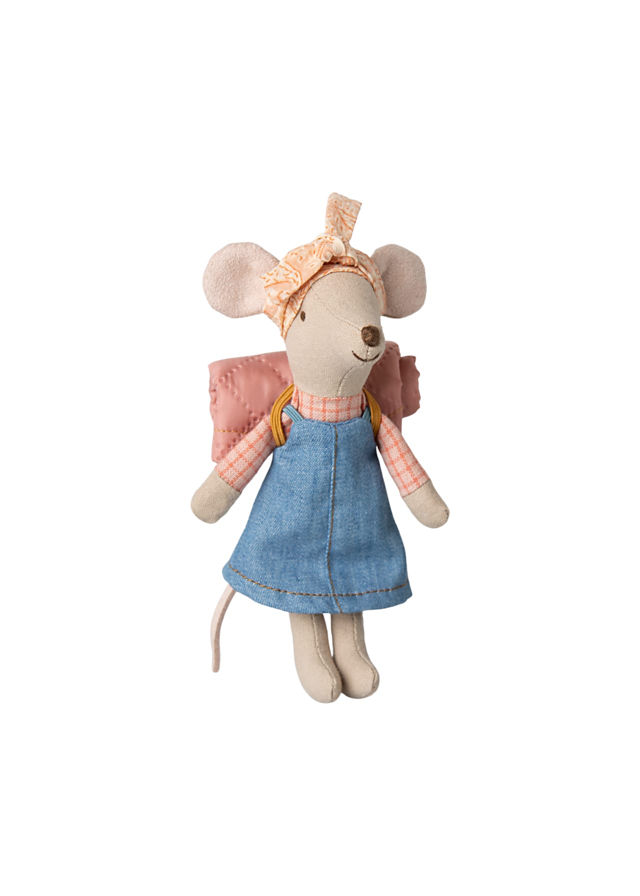 Questo topo è ben preparato per un'escursione nella natura selvaggia. Vestito per giorni di cammino e porta con sé il sacco a pelo per le notti sotto le stelle. Ha delle calamite nelle mani. Aggiungete altri accessori della collezione escursionista.